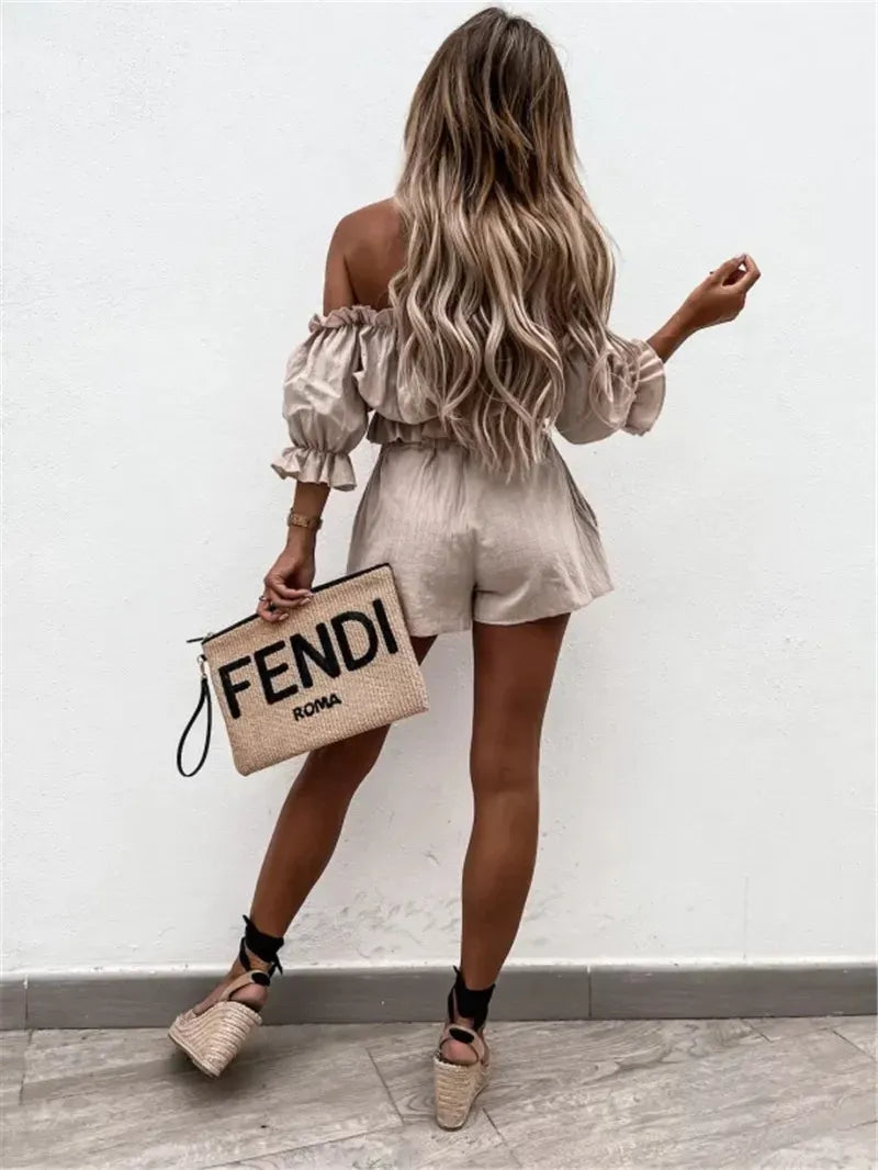 Design: women chic two pieces set, crop tops for women use solid color, short sleeve, off-shoulder, boat neck, wrap chest, backless, exposed navel design, matches elastic high waist shorts, chic and stylish.